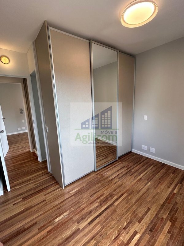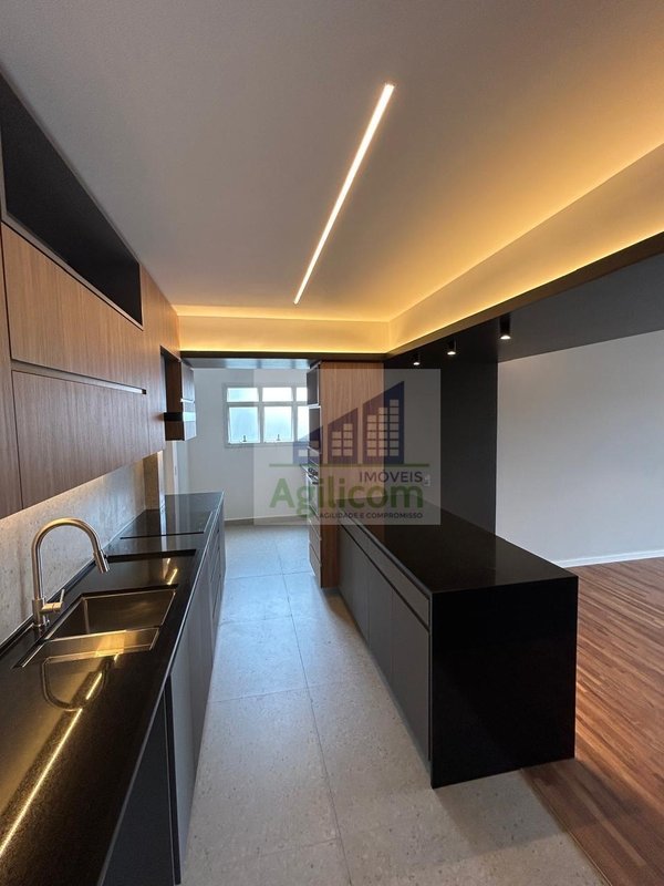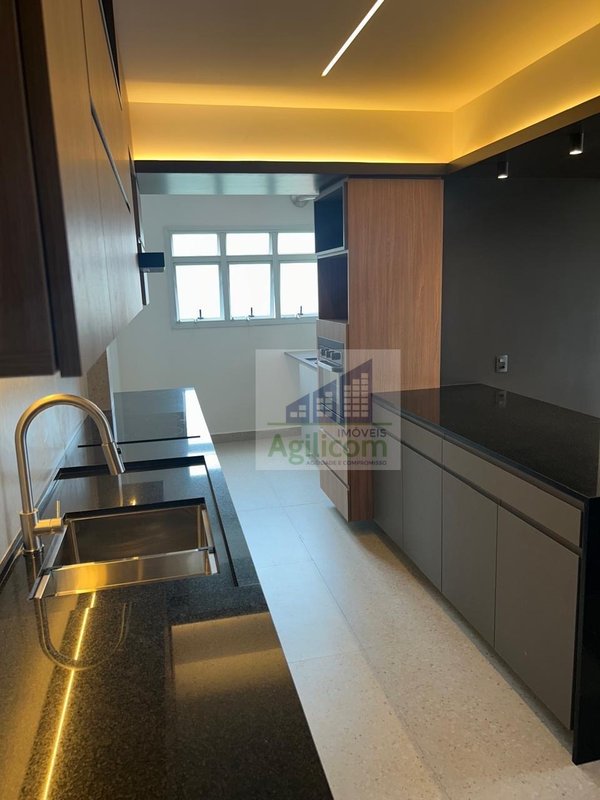 Imóvel repleto de armários, cozinha americana, lavabo, ar condicionado e varanda.