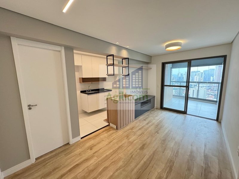 Apartamento de 50m2, com 1 dormitório, 1 banheiro, 1 vaga de garagem, cozinha americana com armários e living com sacada.