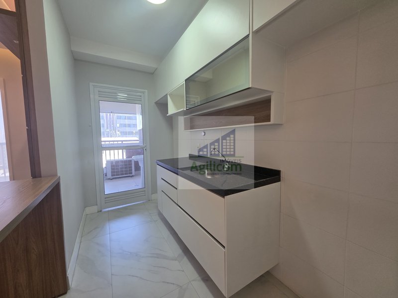 Apartamento de 66m², com 2 dormitórios sendo 1 suíte, 2 banheiros ao total, 1 vaga de garagem, living amplo, cozinha americana com armários, área de serviço e varanda fechada com vidros.