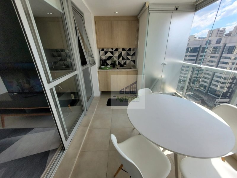 STUDIO MOBILIADO de 37m², com 1 dormitórios, 1 banheiro, 1 vaga de garagem, cozinha americana bem equipada com armários, fogão e geladeira e varanda fechada com vidros.